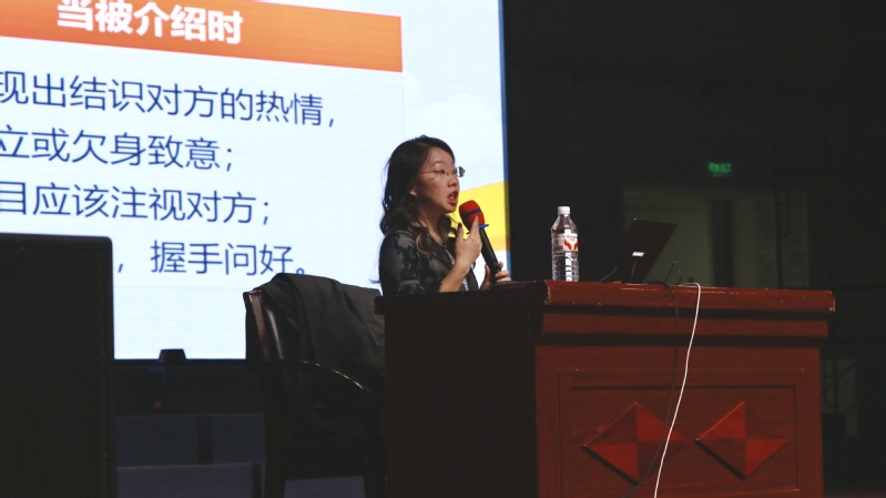 马杰老师主讲大学生文明礼仪教育,围绕礼仪规范与独立能力展开,她通过互动方式引导新生重视个人健康管理与独立能力的培养,并分享了有效沟通与信息处理的方法。结合校园实际场景,讲解握手、着装、电话等日常礼仪,引导新生做好健康管理与时间规划,提升综合素养,尽快融入校园生活。