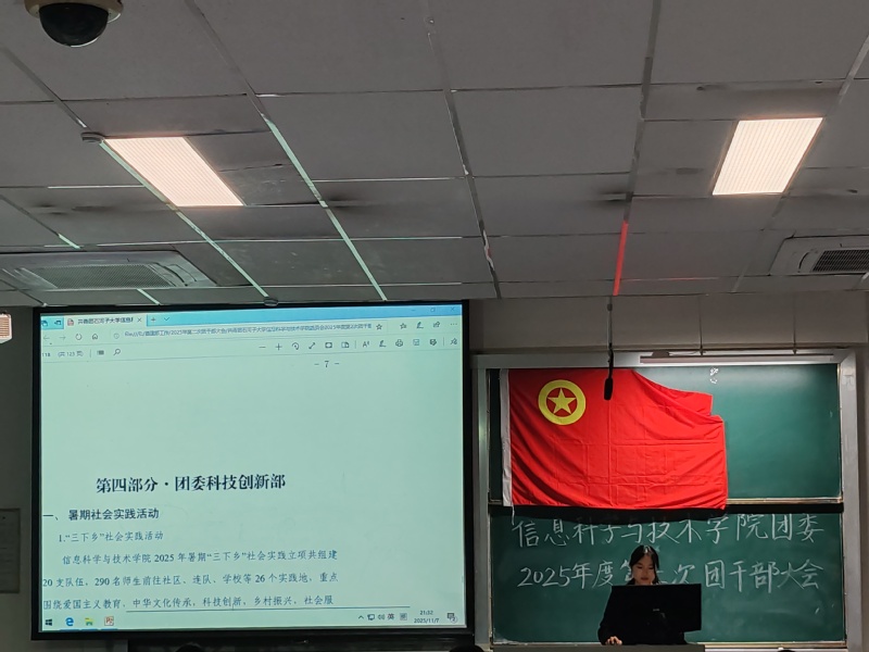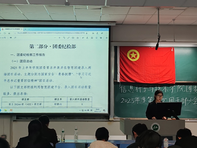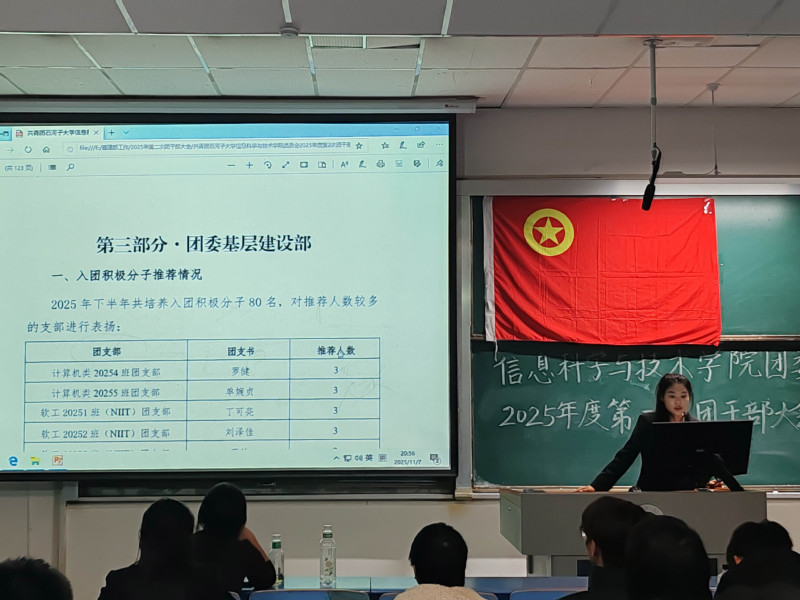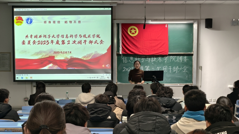 11月7日20时30分,信息科学与技术学院2025年度秋季学期学生团干部大会在绿三204教室召开。会议线上与线下同步进行。学院团委负责人李淑婷老师、院团委各部门成员员以及2023级至2025级全体团干部共同参加。会议明确了新学期团学工作的重点,并对各项工作的流程进行了梳理,以帮助各位团干部更好地开展工作。