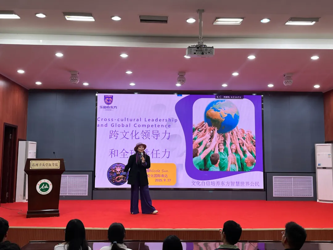 9月27日16时30分,“跨文化领导力和全球胜任力——文化自信培养东方智慧世界公民”主题讲座在石河子大学南区医学院学术报告厅顺利举行。本次讲座特邀2008级英语专业校友、北京乐和心东方国际教育创始人、联合国教科文组织全球合作伙伴Talkmate全球说世界语言地图双语主播导师以及游学中国执行秘书长孙沛主讲,学院党委副书记刘红勤主持。