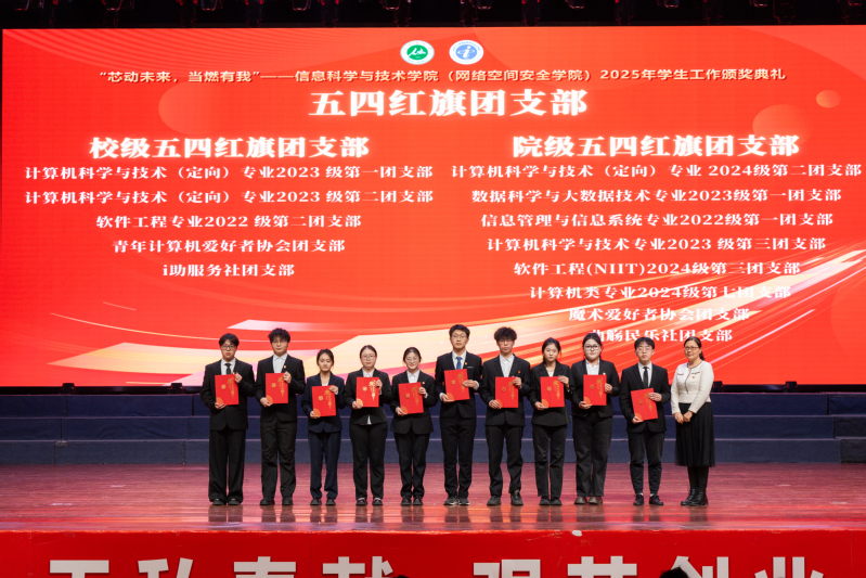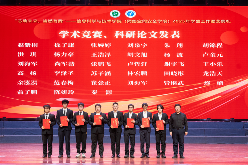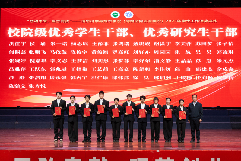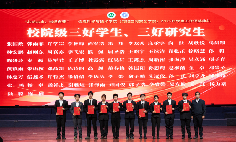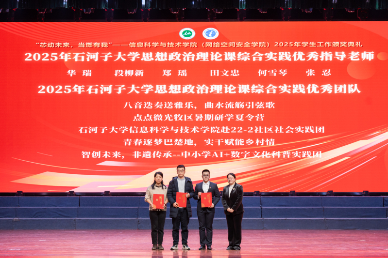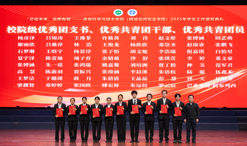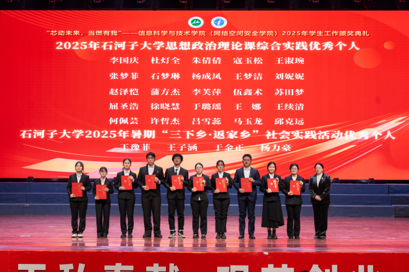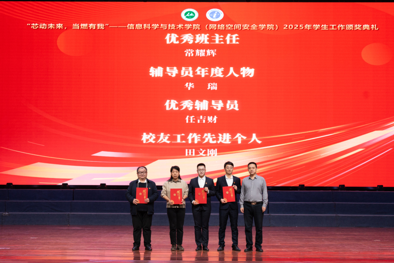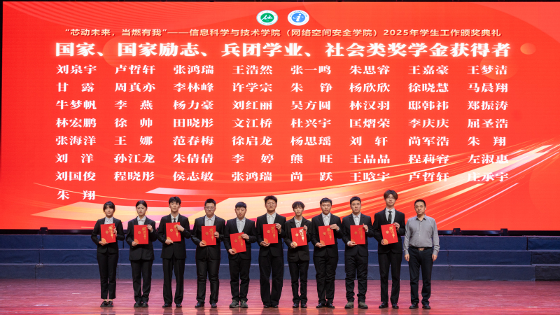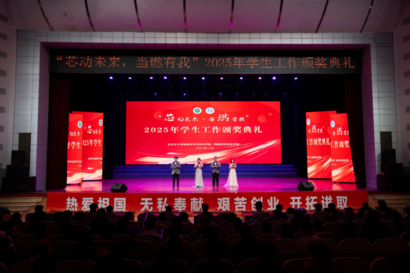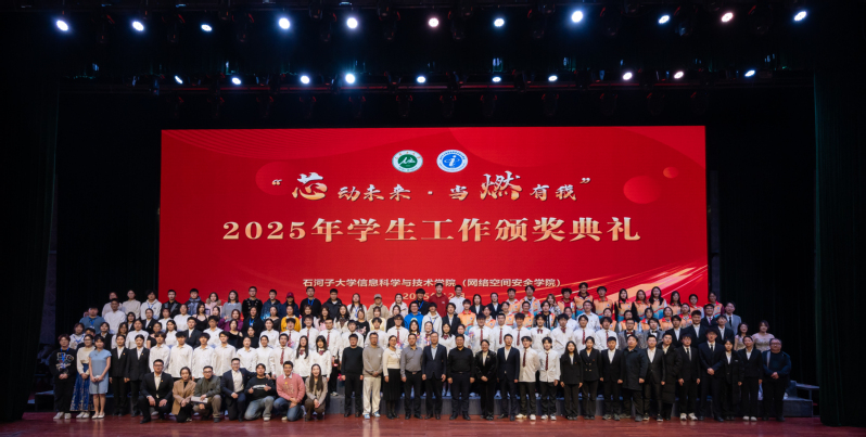 12月15日晚,石河子大学信息科学与技术学院(网络空间安全学院)“芯动未来,当燃有我”2025年学生工作颁奖典礼在北区大会堂隆重举行。校团委书记林秀、党委学生工作部副部长王久龙,学院党委书记戴建国、院长李志刚、党委副书记刘红勤、副院长宋伟、高攀、张丽,各系主任、全体班主任、辅导员与师生代表齐聚一堂,共同回顾年度工作,表彰先进典型,凝聚奋进共识。