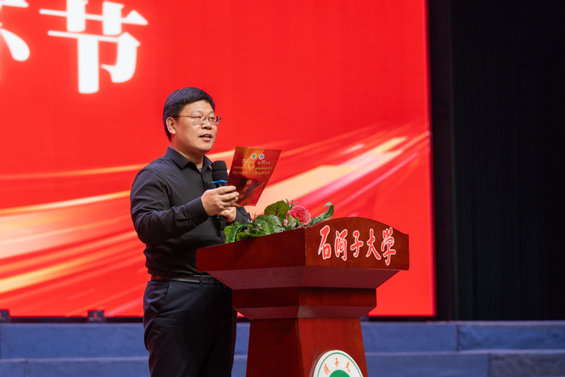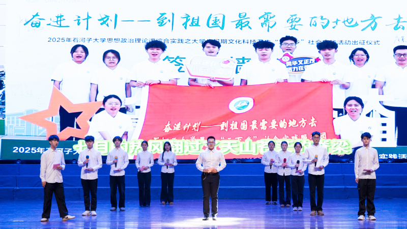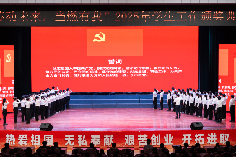 篇章由党员、入党积极分子代表与大学生艺术团IMP乐团交响乐部共同演绎的音乐诗朗诵《我和我的祖国,以初心赴荣光》深情开篇,抒发爱国赤诚。紧接着,学院全体转正预备党员在党旗下庄严宣誓,重温入党誓词。铿锵有力的誓言响彻会场,彰显了青年党员坚定的理想信念与初心使命,将现场氛围推向了一个庄重而激昂的高潮。学院党委书记戴建国为获得国家奖学金、国家励志奖学金、兵团学业奖学金等各类奖学金获奖代表颁奖,寄语学子格物求真,立志成为栋梁之材。副院长高攀为在学科竞赛、科研论文中取得突出成绩的创新先锋颁奖,赞扬其探索精神。党委副书记刘红勤为社会实践优秀团队、指导教师及个人优秀代表颁奖。随后,赴吐鲁番托克逊县夏镇泛海希望小学社会实践团真情讲述了他们的实践故事。