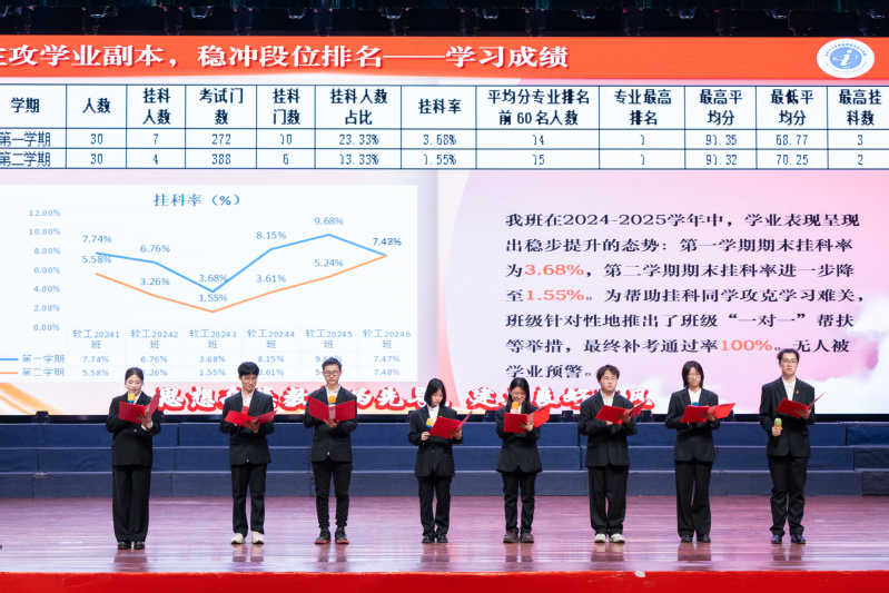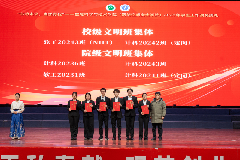 篇章在曲觞民乐社的《绮望·水龙吟》与I-Show艺术团《铃鼓姑娘》的优雅韵律中启幕。随后,党委学生工作部副部长王久龙为荣获校院级三好学生、优秀学生干部等称号的学生代表颁奖,勉励同学们勤学修德,全面发展。学院党委书记戴建国为优秀班主任、辅导员等教师代表颁奖,向全体育人工作者的辛勤付出致敬。副院长宋伟为校院级文明班集体代表颁奖,表彰优秀集体的凝聚力量。颁奖结束后,校级文明班集体软件工程(NIIT)20243班进行了风采展演。
