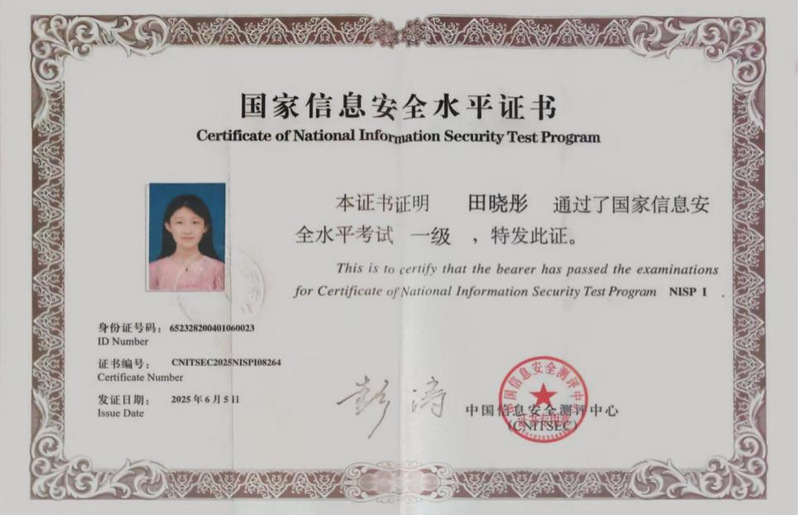 田晓彤深知,扎实的专业基础是未来发展的根本。在学业上,她始终以严谨认真的态度对待专业学习,本科三年综合成绩位居专业第4名,专业课平均成绩89.82,绩点3.98。同时,她也注重技能与证书的获取,顺利通过英语四级,取得NISP一级证书和数据库系统工程师证书。