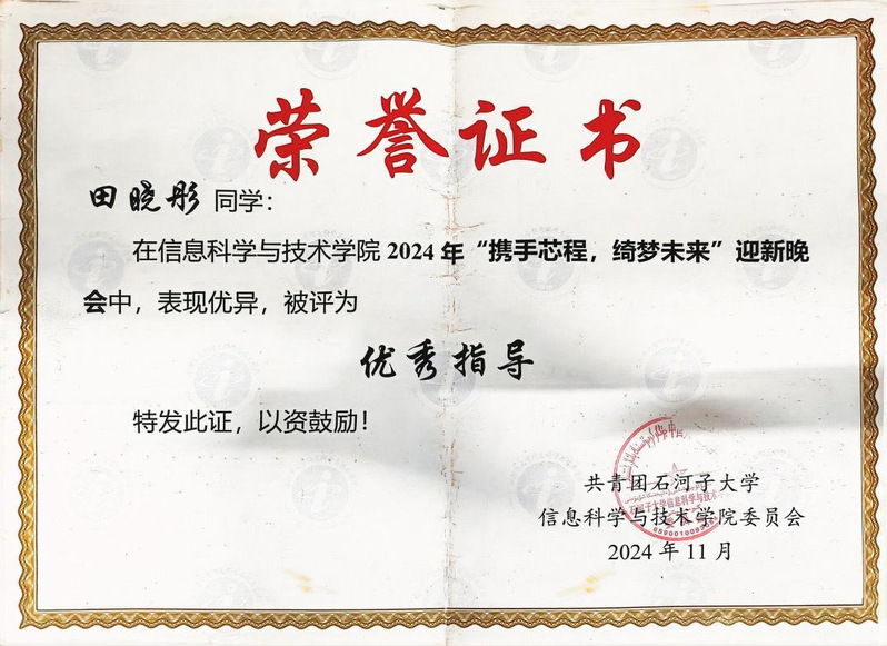 学业之外,田晓彤的身影活跃在多个舞台。她先后担任班级宣传委员、学导、石河子大学心理协会宣传部副部长,在各类工作中锻炼组织协调与沟通能力。志愿汇时长累计达185小时,在新生迎新晚会中因积极指导荣获优秀指导称号;还参与三下乡、云支教等活动,在奉献中更深刻体悟到责任与担当的意义。