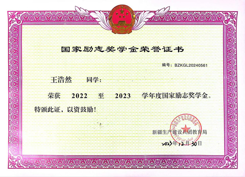 大学四年综合测评成绩排名专业第三,平均学分绩点排名专业第二。曾获国家奖学金、国家励志奖学金以及石河子大学“三好学生”、石河子大学“优秀共青团员”等荣誉称号;获全国高校计算机能力挑战赛国家二等奖、西北赛区一等奖,全国大学生数学建模竞赛省级一等奖等20余项国家级、省部级及校级奖项。拥有2项独作计算机软件著作权;积极投身志愿服务,志愿总时长148小时。