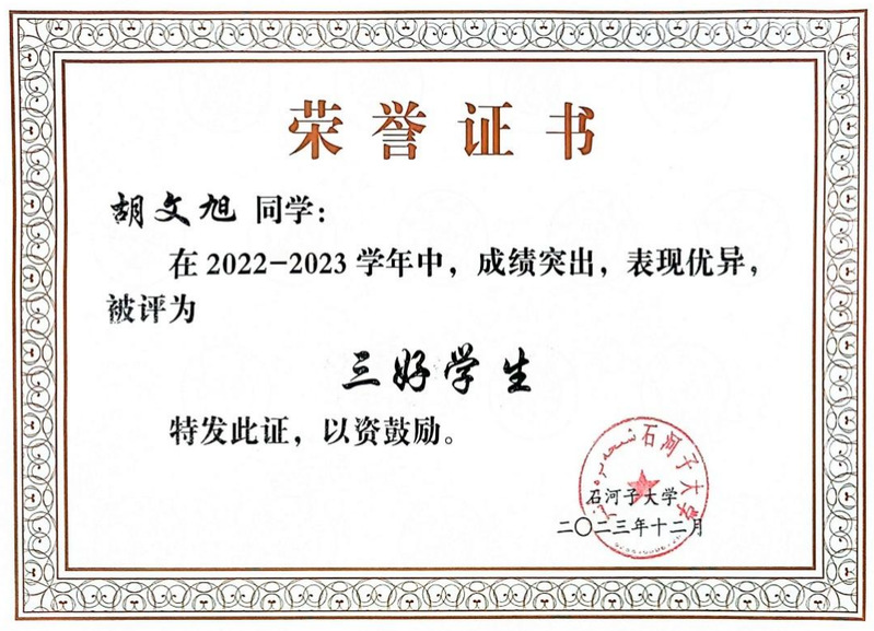 胡文旭,石河子大学信息科学与技术学院计算机科学与技术专业2022级本科生,汉族,共青团员,西安电子科技大学交换生。