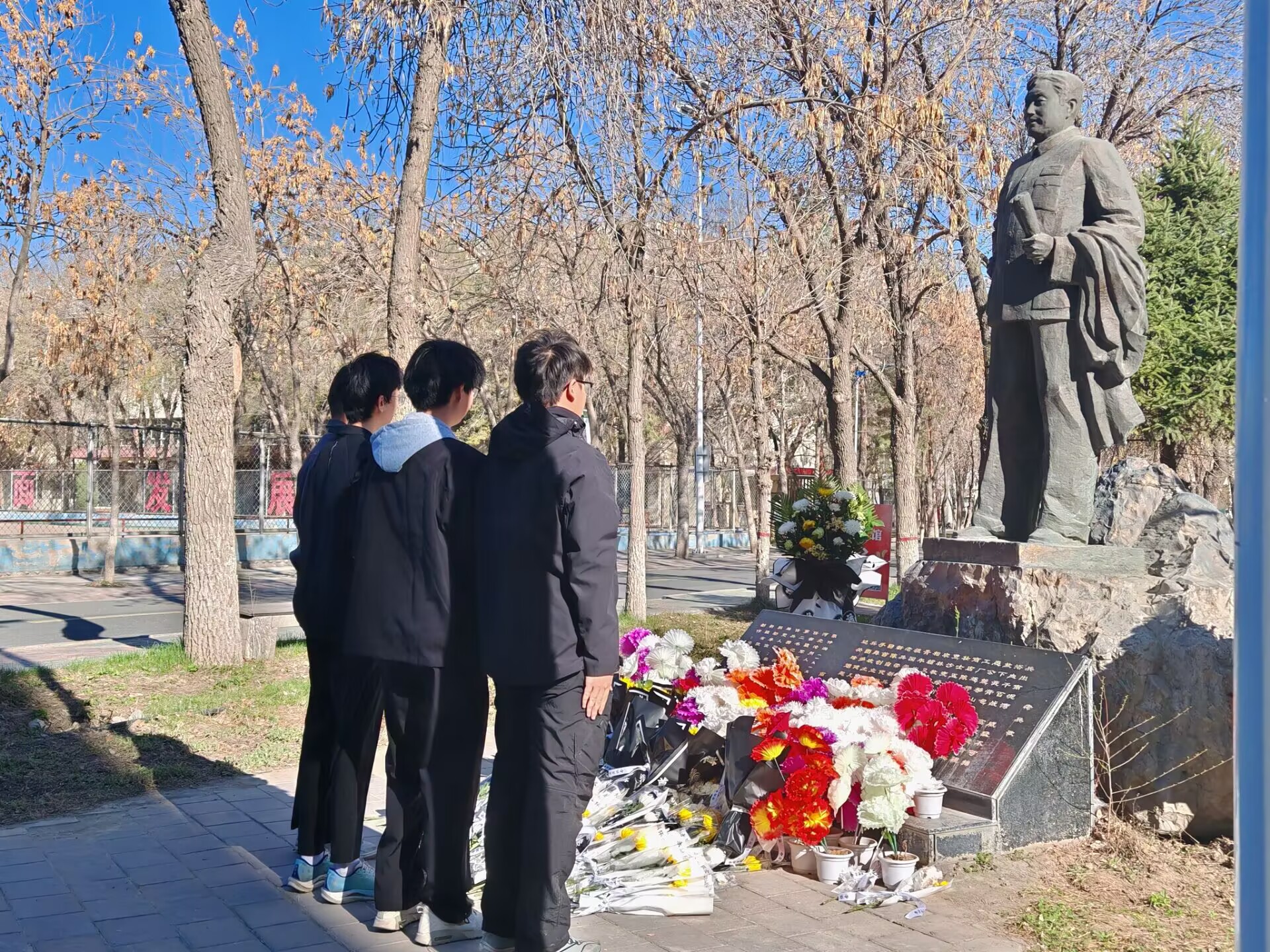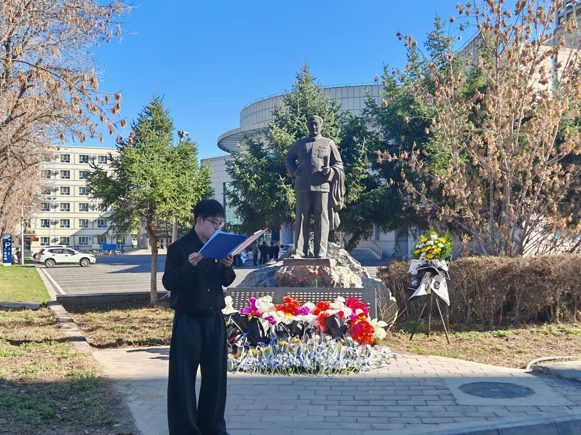 活动开始,全体人员列队肃立。预备党员赵则东讲述了张仲瀚将军的生平事迹,带领大家回顾了将军坚守信仰、无私奉献、勇担使命的军垦岁月。随后,党员同志们依次上前敬献鲜花,向将军雕像行鞠躬礼,表达对将军的深切哀思与崇高敬意。