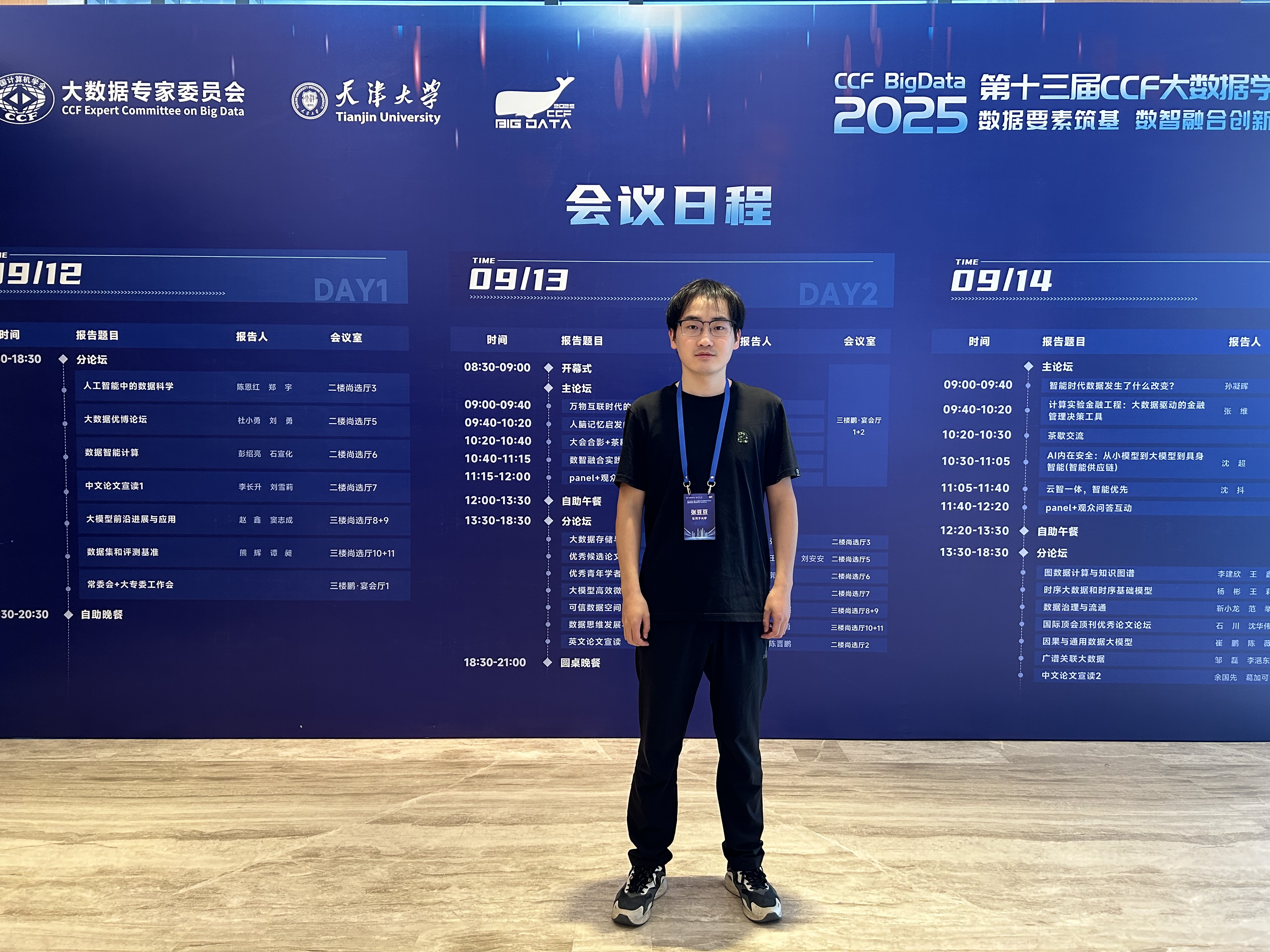 2025年9月12日至14日,第十三届CCF大数据学术会议(CCF BigData2025)在天津召开。作为国内大数据领域最具影响力的年度学术活动,本次会议由 CCF 大数据专家委员会承办,邀请国内外专家学者围绕数字经济与大模型时代下的大数据处理、管理、分析及治理等前沿议题展开深度研讨,为学术界、工业界及相关职能部门搭建交流合作平台,推动大数据技术创新与产业应用融合发展。石河子大学信息科学与技术学院(网络空间安全学院)院长、计算智能与网络信息安全兵团重点实验室主任李志刚教授,多年来一直积极参与此类学术盛会。今年的会议中,他所指导的二位研究生—— 向威、张豆豆受邀参会,展示数据科学领域研究成果。