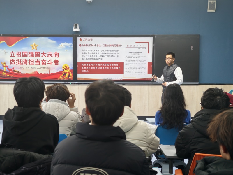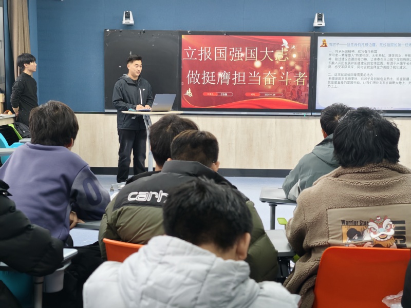 11月28日,软工20254班(NIIT)开展“立报国强国大志,做挺膺担当奋斗者”主题班会。班会由班长宋天主持,此次活动邀请辅导员华瑞老师与2022级于永强学长分享经历,引导同学们将个人理想融入国家发展大局,用实际行动践行“强国有我”的青春誓言。
