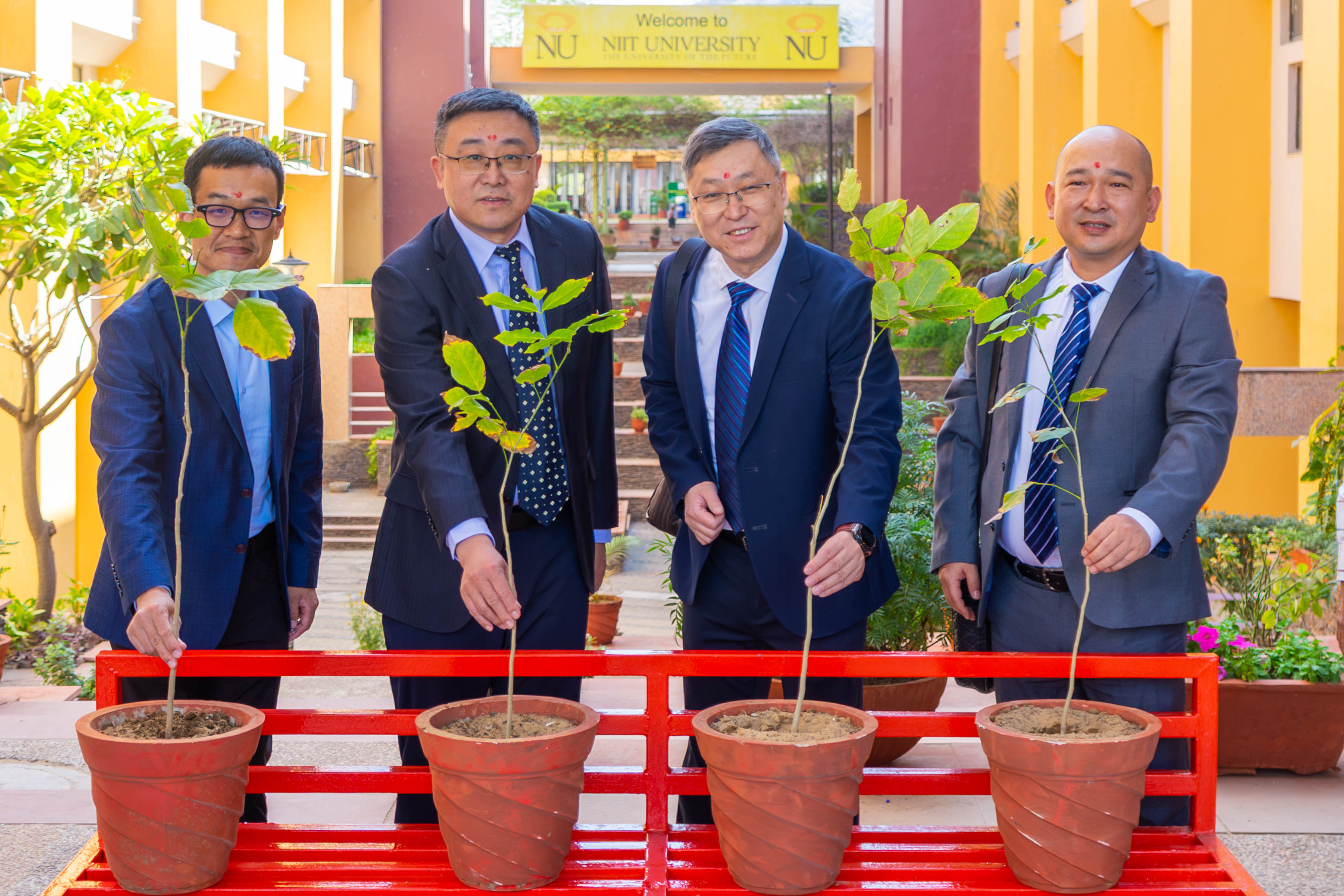 李志刚教授一行抵校当日,NU教务长Dr. Shivendra Mathur及师生表示欢迎。NU学生按照印度传统礼仪,为代表团成员点施眉心红点(Tilak)并撒花祝福。随后,三位教师在校园内共同种下一棵象征两校友谊的树木。NIIT中方代表郭浩担任印方翻译,齐全副教授担任中方翻译,双方沟通顺畅。
